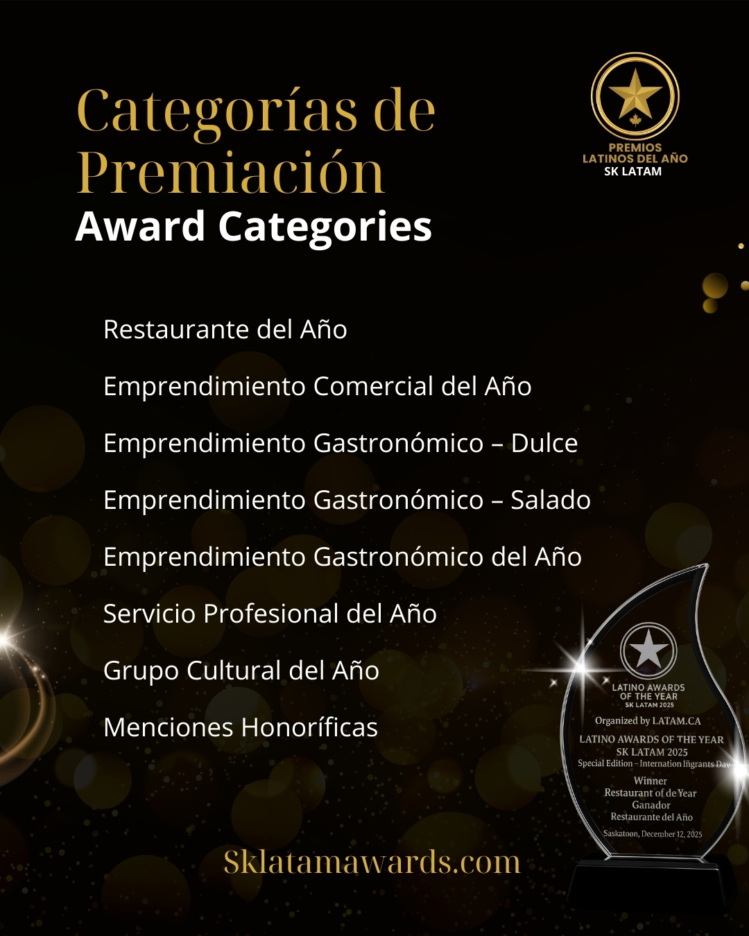 A continuación encontrarás cada una de las seis categorías de los Premios Latinos de Saskatoon, junto a los nominados que representan el crecimiento, la creatividad y el aporte de nuestra comunidad en la ciudad.